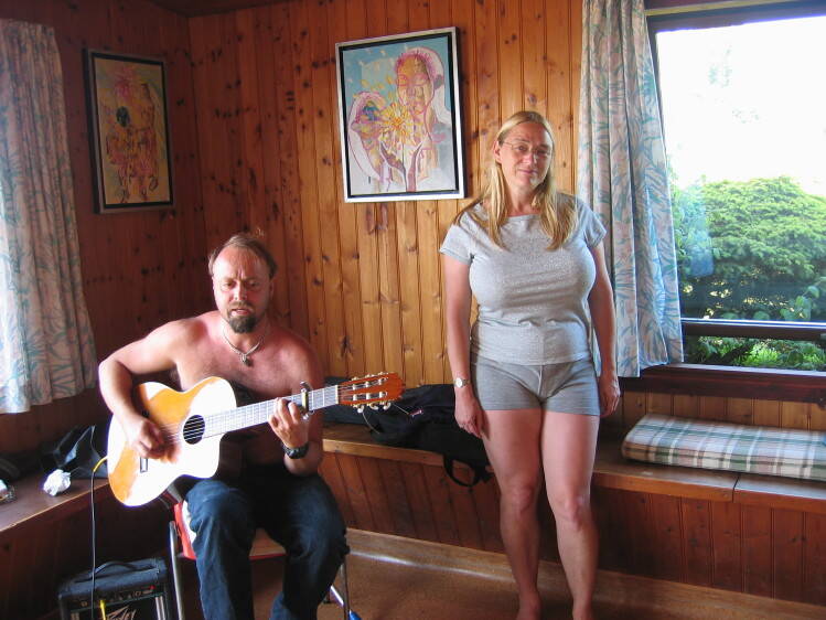 Lars and Lotte at a small exhibition in their campsite with their wedding paintings behind 2004.